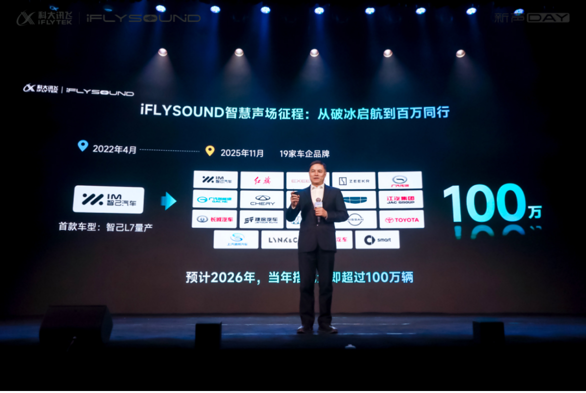 AI新声代,重塑新格局!自2022年首款搭载车型量产至今,iFLYSOUND智慧声场已与19家车企品牌达成合作,落地超100万辆车。从破冰启航到百万同行,这不仅是数字的突破,更标志着iFLYSOUND智慧声场奏响中国AI音响品牌崛起的新篇章。