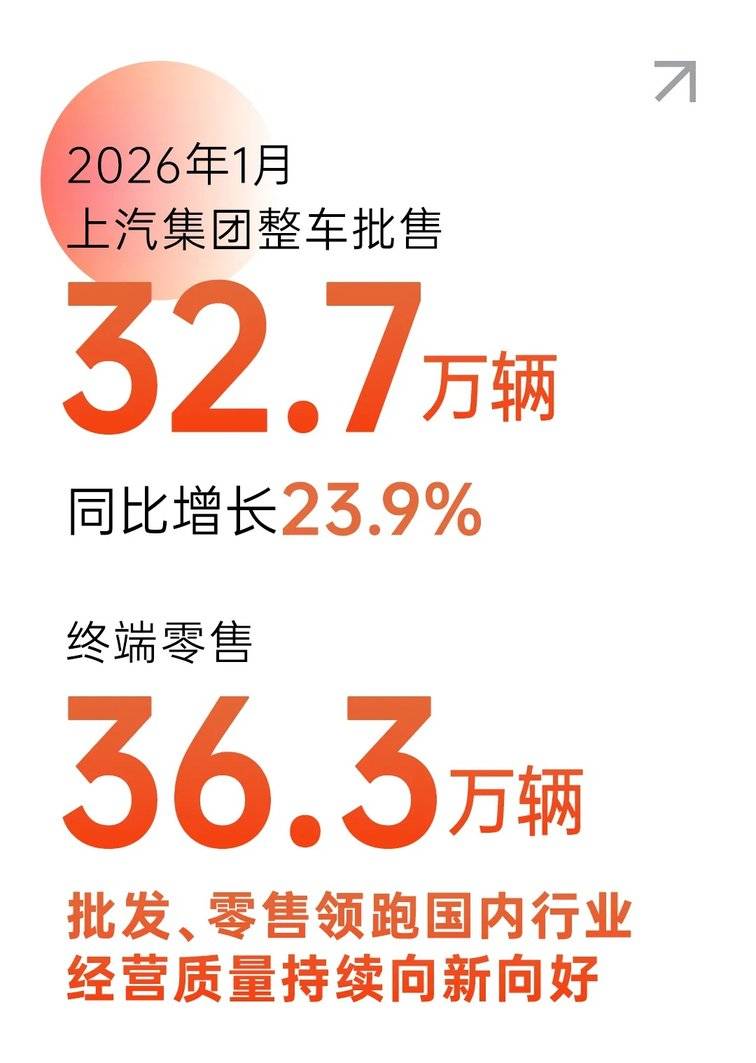 2026年开年,上汽集团以一份含金量十足的“开门红”业绩,叩响了“十五五”的开局之门:1月整车批售32.7万辆,同比激增23.9%,终端零售更高达36.3万辆,双双领跑国内行业。这并非一次偶然的反弹,而是继2025年实现全年两位数增长后,改革动能持续释放的必然结果。从去年“全面深化改革”的破局,到今年初“技术+用户”双轮驱动的清晰呈现,上汽正以坚定的步伐,为中国汽车产业的转型升级,演绎出一个厚重而鲜活的“上汽范式”。